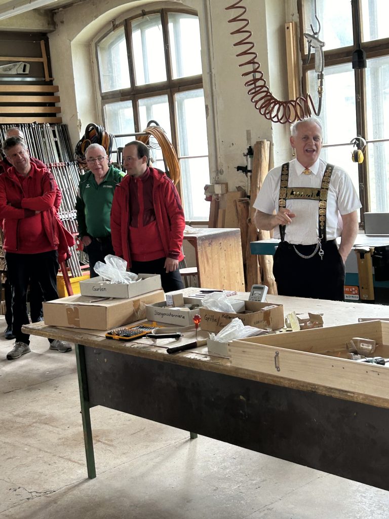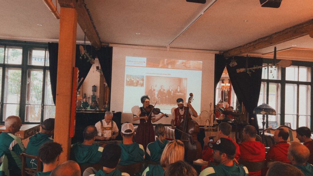 Ein ganz wichtiger Aspekt von so einem Trainingsweekend ist der gesellige Teil. Die Turnerinnen und Turner mit einer Alterspanne von über 50 Jahren (16 bis über 66) hatten genügend Zeit, sich nach den Trainings untereinander auszutauschen oder sich für den kommenden Tag wieder zu stärken. Das Highlight kultureller Art war der Besuch und die Führung von Werner Alder durch seine Hackbrettfabrik in Herisau. Dort bekamen wir schliesslich vom “Trio rund om de Säntis” live vorgetragen eine Einführung in die appenzellerische Streichmusik- und Brauchtumstradition.